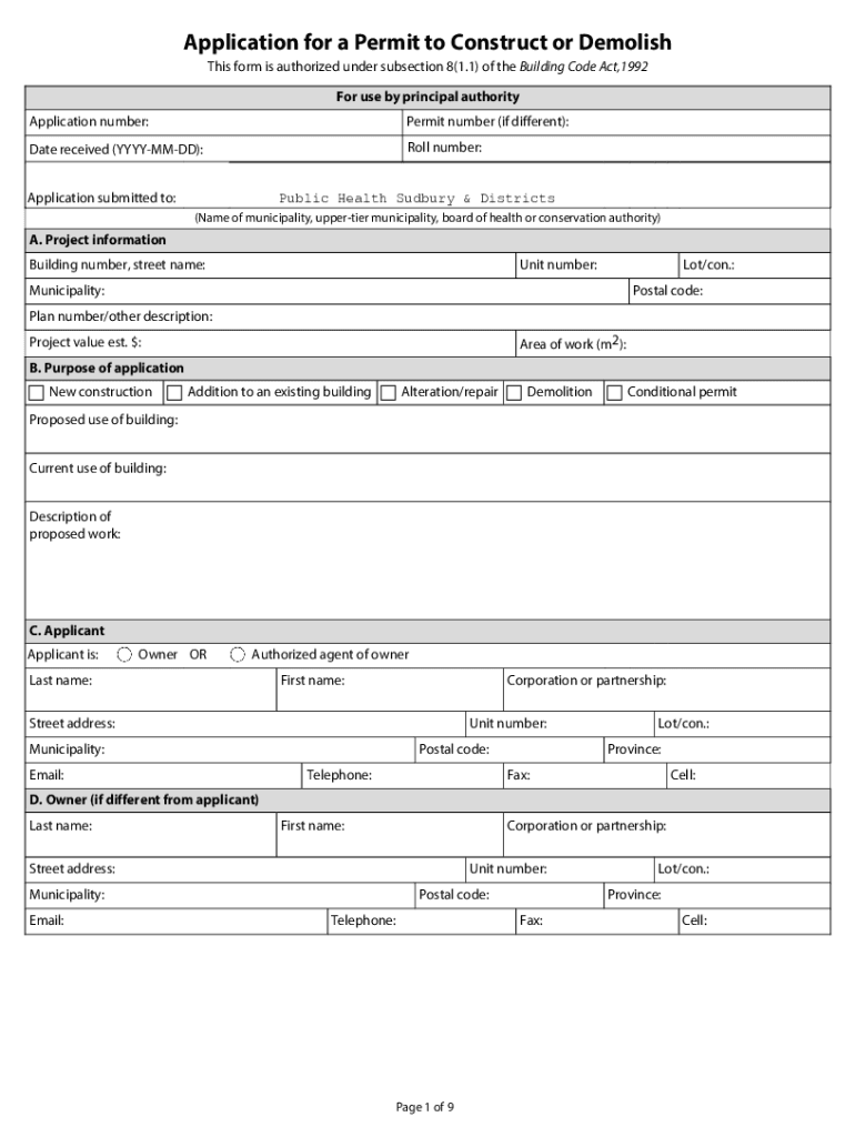 Application for a Permit to Construct or Demolish This form is authorized under subsection 8(1.1) of the Building Code Act,1992 For use by principal authority Application number:Permit number (if