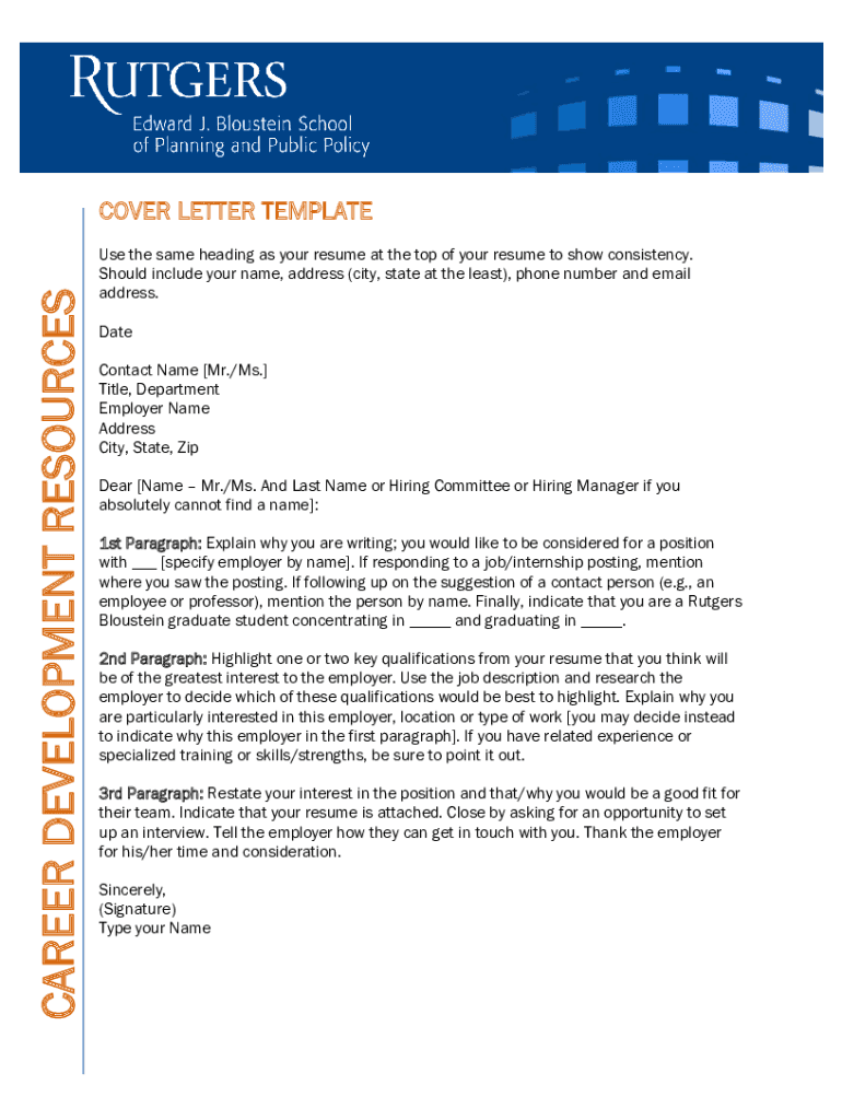 CAREER DEVELOPMENT RESOURCESCOVER LETTER TEMPLATE Use the same heading as your resume at the top of your resume to show consistency. Should include your name, address (city, state at the least), phone