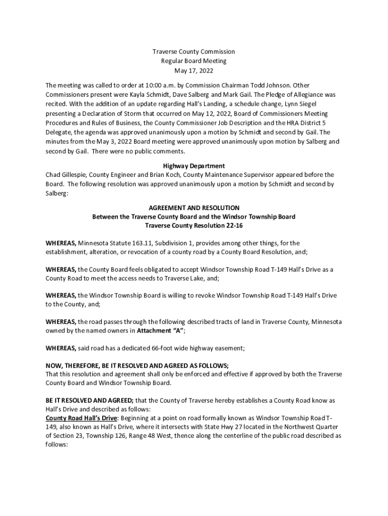 Traverse County Commission Regular Board Meeting May 17, 2022, The meeting was called to order at 10:00 a.m. by Commission Chairman Todd Johnson. Other Commissioners present were Kayla Schmidt, Dave