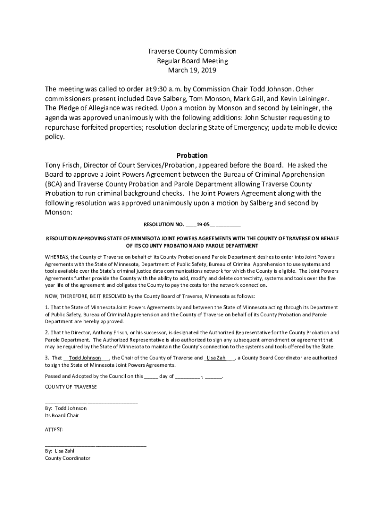 Traverse County Commission Regular Board Meeting March 19, 2019, The meeting was called to order at 9:30 a.m. by Commission Chair Todd Johnson. Other commissioners present included Dave Sal berg,