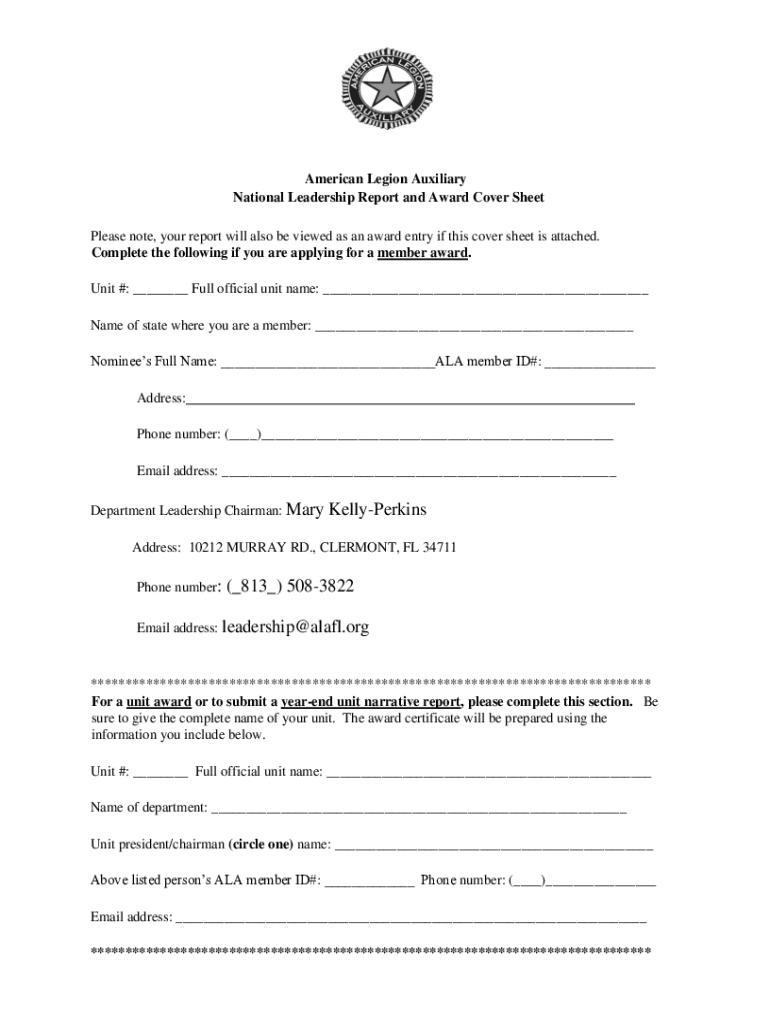 American Legion Auxiliary National Leadership Report and Award Cover Sheet Please note, your report will also be viewed as an award entry if this cover sheet is attached. Complete the following if
