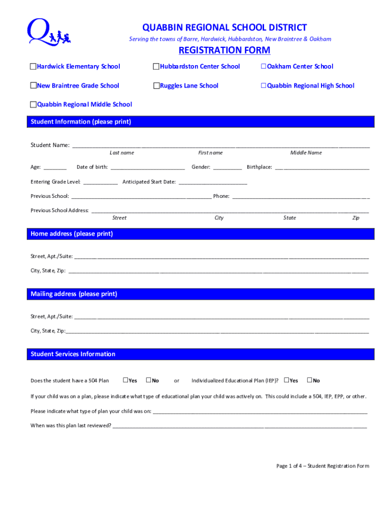 Get the free New Student Registration - Quabbin Regional School District