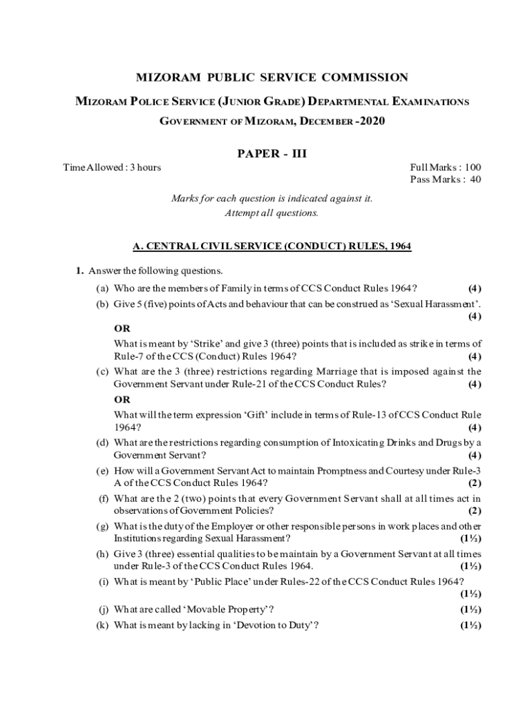 MIZORAM PUBLIC SERVICE COMMISSIONMIZORAM POLICE SERVICE (JUNIOR GRADE) DEPARTMENTAL EXAMINATIONS GOVERNMENT OF MIZORAM, DECEMBER 2020 PAPER III Time Allowed : 3 hurtful Marks : 100 Pass Marks : 40