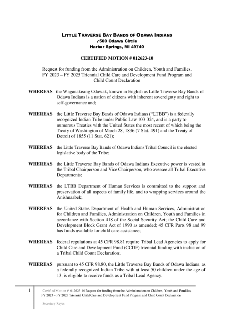 LITTLE TRAVERSE BAY BANDS OF OD AWA INDIANS 7500 Data Circle Harbor Springs, MI 49740CERTIFIED MOTION # 01262310 Request for funding from the Administration on Children, Youth and Families, FY 2023