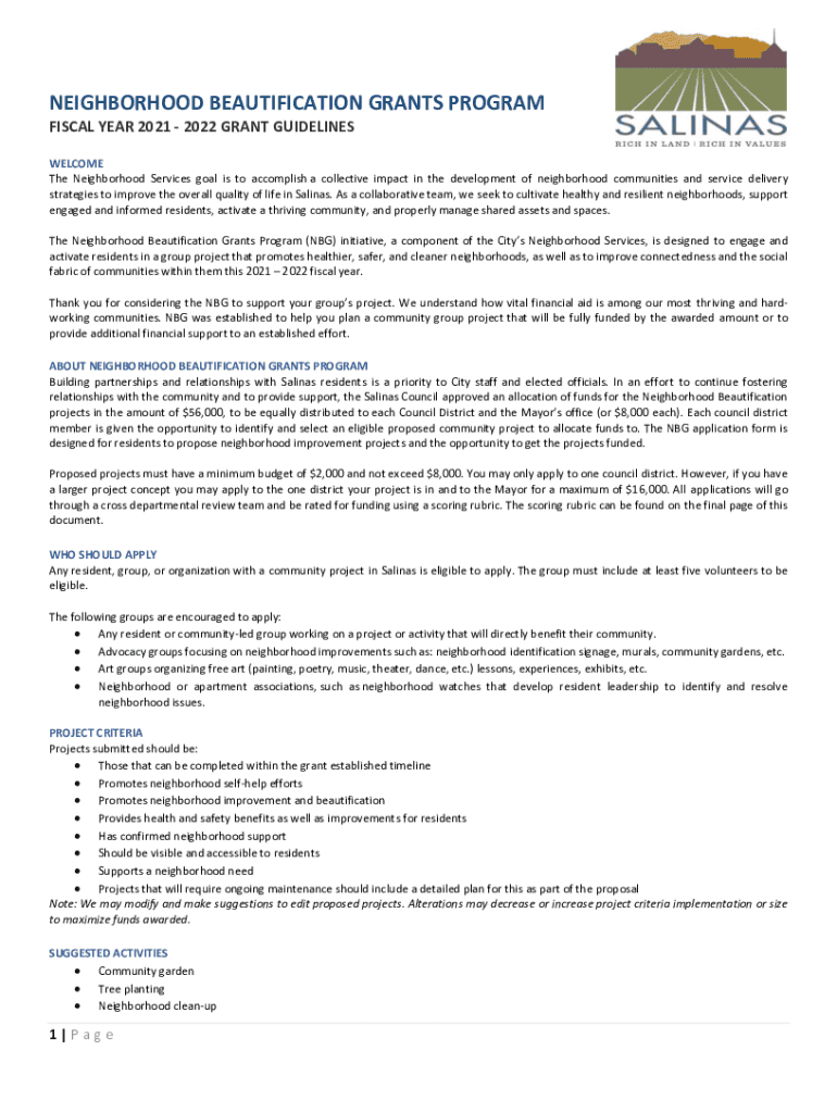 NEIGHBORHOOD BEAUTIFICATION GRANTS PROGRAM FISCAL YEAR 2021 2022 GRANT GUIDELINES WELCOME The Neighborhood Services goal is to accomplish a collective impact in the development of neighborhood communities