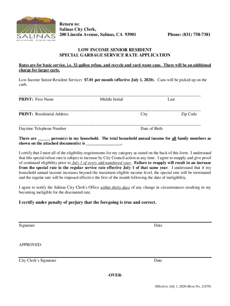 Return to: Salinas City Clerk, 200 Lincoln Avenue, Salinas, CA 93901Phone: (831) 7587381LOW INCOME SENIOR RESIDENT SPECIAL GARBAGE SERVICE RATE APPLICATION Rates are for basic service, i.e. 32gallon