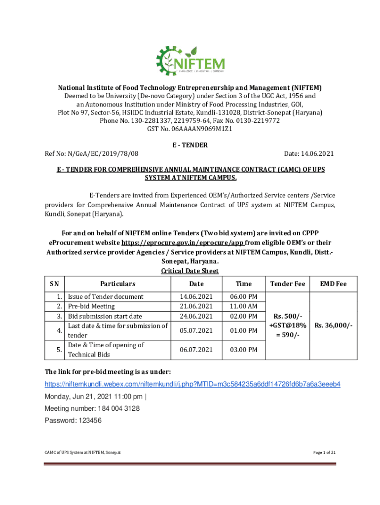 National Institute of Food Technology Entrepreneurship and Management (NIF TEM) Deemed to be University (Lenovo Category) under Section 3 of the UGC Act, 1956 and an Autonomous Institution under Ministry