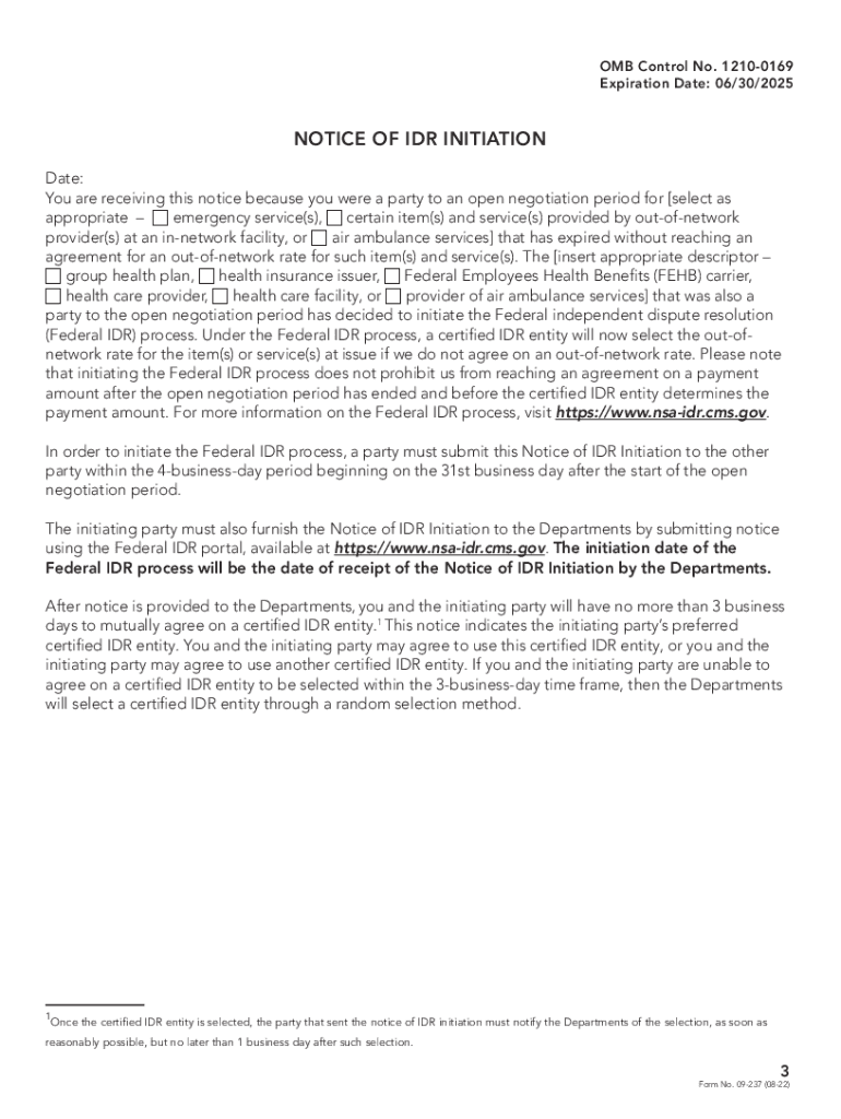 OMB Control No. 12100169 Expiration Date: 06/30/2025NOTICE OF IDR INITIATION INSTRUCTIONS The Departments of the Treasury, Labor, and Health and Human Services (Departments) and the Office of Personnel
