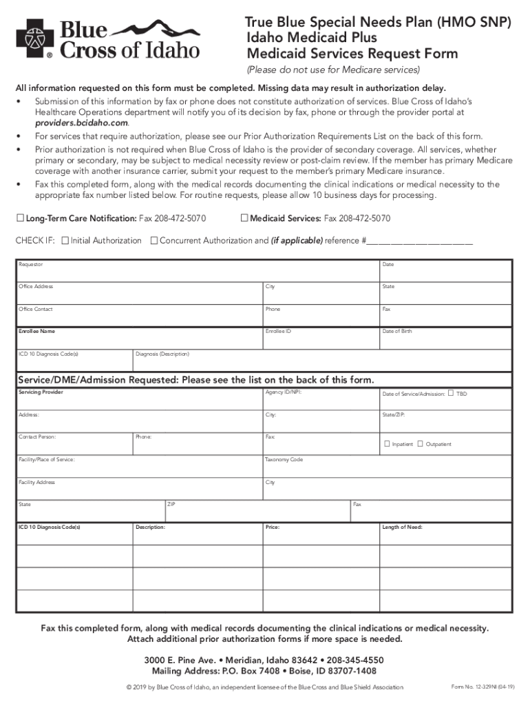 True Blue Special Needs Plan (HMO SNP) Idaho Medicaid Plus Medicaid Services Request Form (Please do not use for Medicare services) All information requested on this form must be completed. Missing