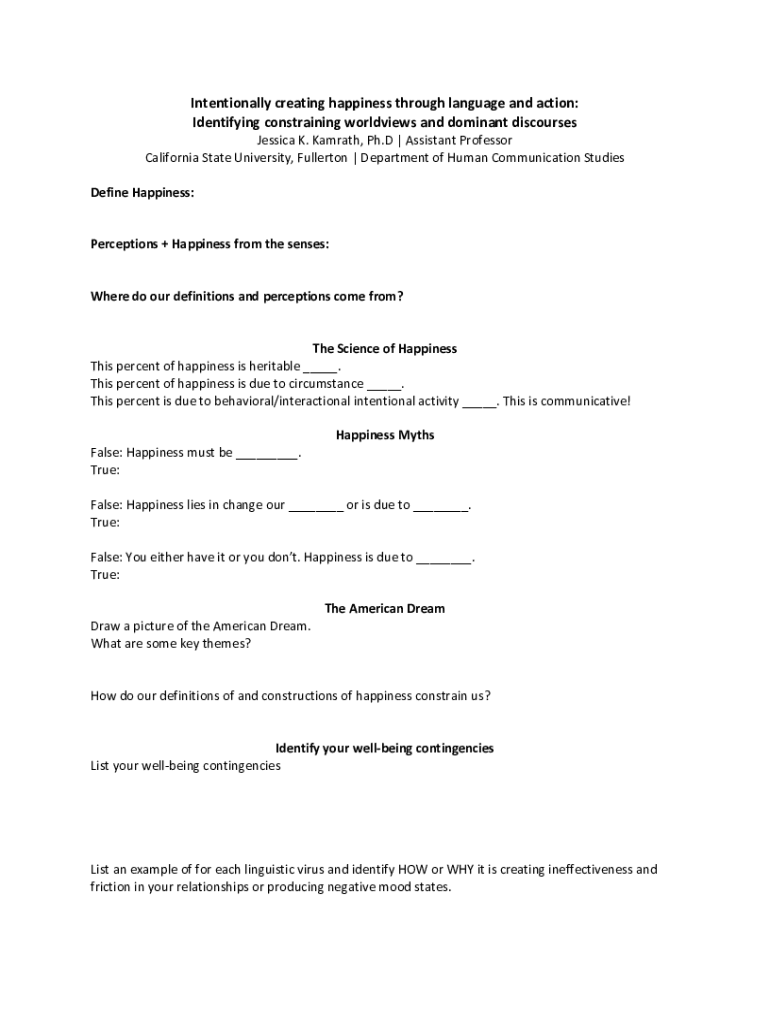 Intentionally creating happiness through language and action: Identifying constraining worldviews and dominant discourses Jessica K. Karate, Ph.D. | Assistant Professor California State University,