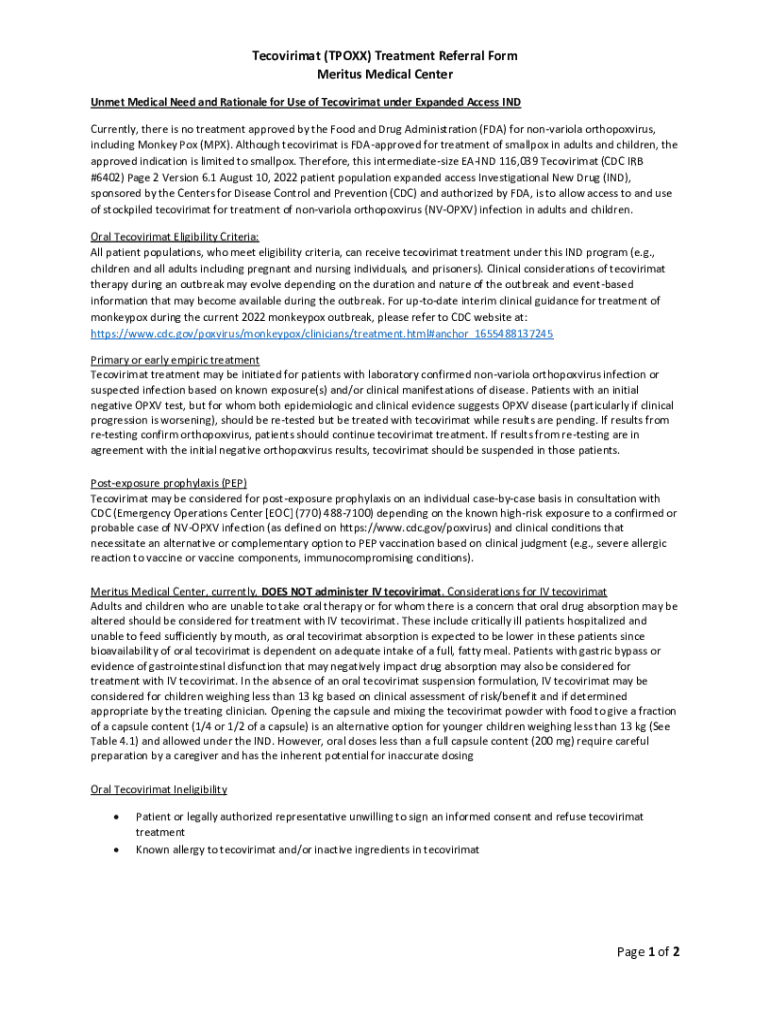 Get the free Tecovirimat (TPOXX) Treatment Referral Form Meritus ...