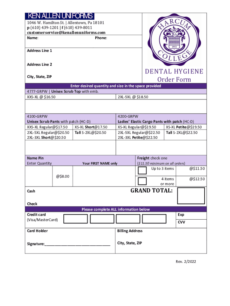 KEN ALLEN UNIFORMS 1046 W. Hamilton St. | Allentown, Pa 18101 p (610) 4391201 | f (610) 4398011 customerservice@kenallenuniforms.com Name: Phone: Address Line 1 Address Line 2DENTAL HYGIENE Order