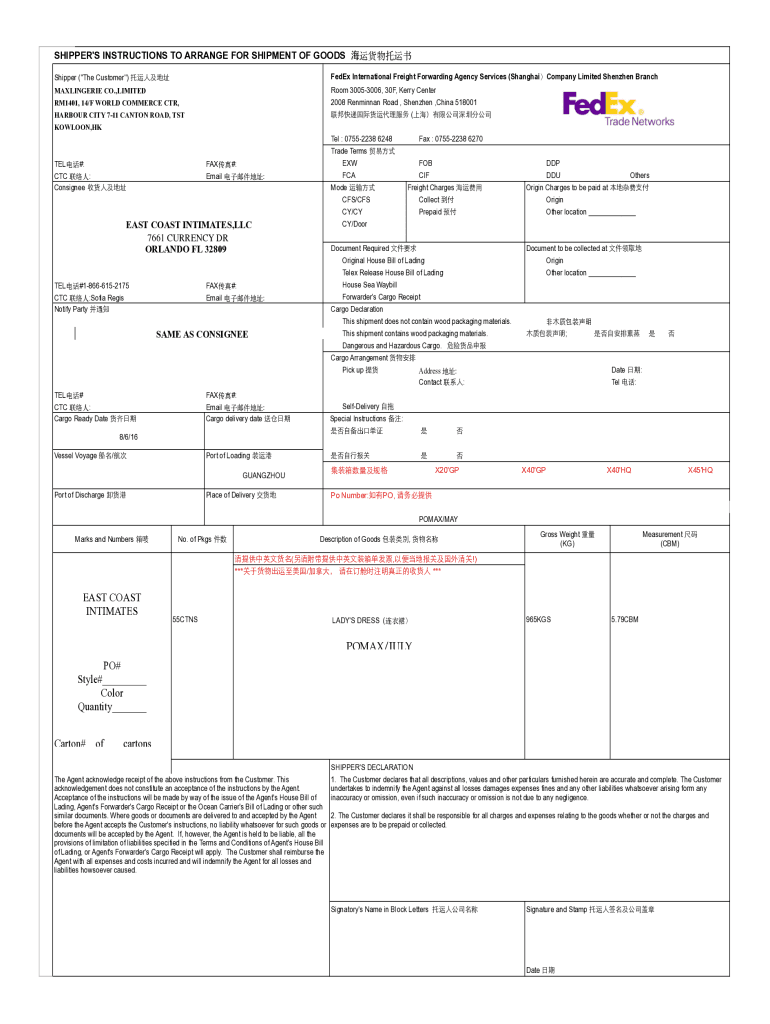 SHIPPER\'S INSTRUCTIONS TO ARRANGE FOR SHIPMENT OF GOODS Shipper (\” The Customer\”) FedEx International Freight Forwarding Agency Services (ShanghaiCompany Limited Shenzhen BranchMAXLINGERIE