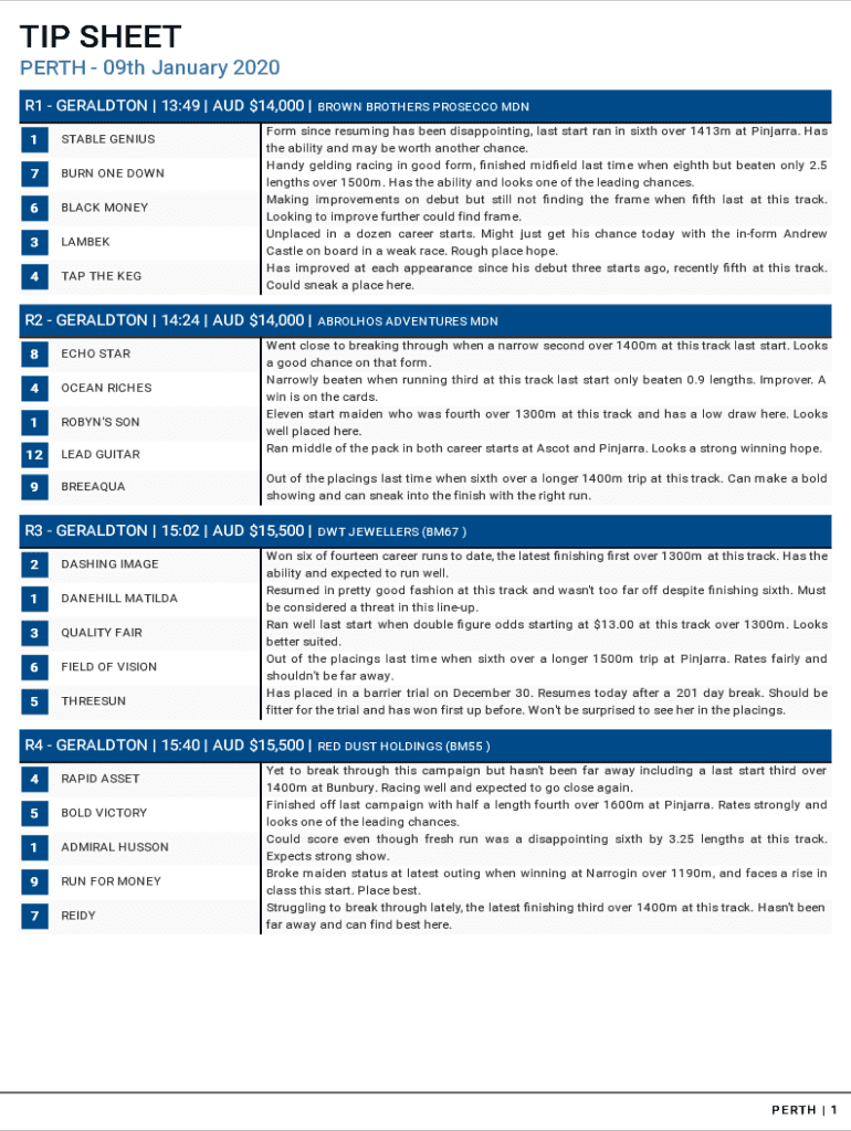 TIP SHEET PERTH 09th January 2020 R1 GERALDTON | 13:49 | AUD $14,000 | 1STABLE GENIUS7BURN ONE DOWN6BLACK MONEY3LAMBEK4TAP To Perform since resuming has been disappointing, last start ran in sixth