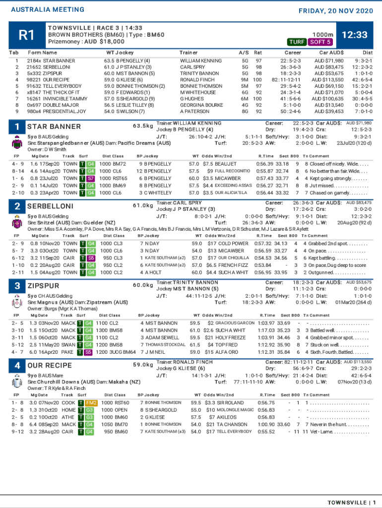 AUSTRALIA MEETING T O W NS VI LEE | R ACE 3 | 14:33 BROWN BROTHERS (BM60) | Type : BM60 Prize money : AUD $18, 000R1 Tab 1 2 3 4 5 6 7 8 91 FP4 9 8 14 1 6 2 9 2 102 FP2 9 5 7 6 12 1 10 2 113FRIDAY,