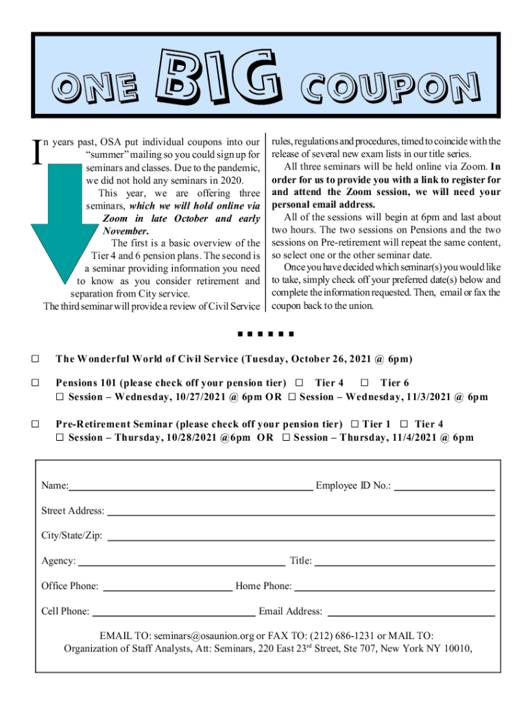 One Big Coupon years past, OSA put individual coupons into our summer mailing, so you could sign up for seminars and classes. Due to the pandemic, we did not hold any seminars in 2020. This year,