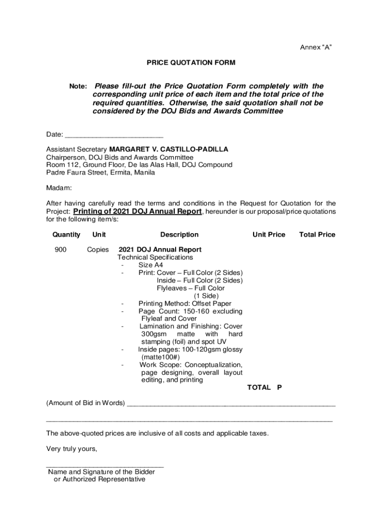 Annex A PRICE QUOTATION Footnote: Please fall out the Price Quotation Form completely with the corresponding unit price of each item and the total price of the required quantities. Otherwise, the