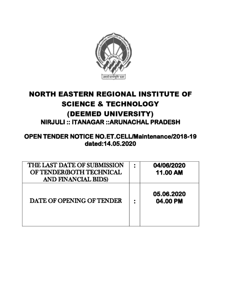 NORTH EASTERN REGIONAL INSTITUTE OF SCIENCE & TECHNOLOGY (DEEMED UNIVERSITY) VIRGULE :: TANAGER ::ARUNACHAL PRADESH OPEN TENDER NOTICE NO.ET.CELL/Maintenance/201819 dated:14.05.2020 THE LAST DATE