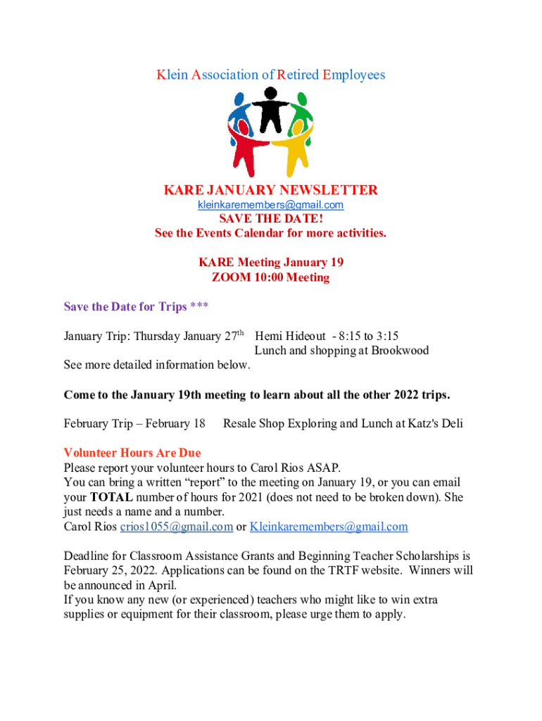 Klein Association of Retired EmployeesKARE JANUARY NEWSLETTER kleinkaremembers@gmail.comSAVE THE DATE! See the Events Calendar for more activities. ARE Meeting January 19 ZOOM 10:00 Meeting Save the