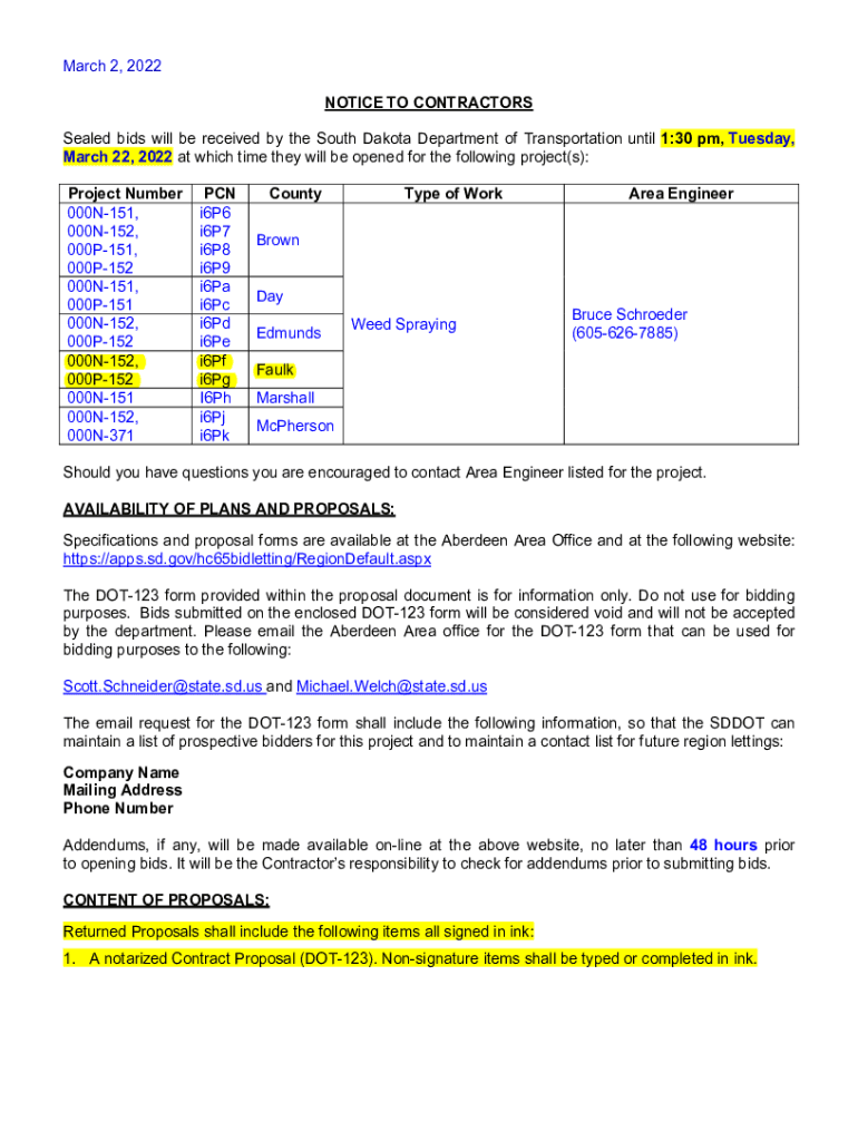 March 2, 2022, NOTICE TO CONTRACTORS Sealed bids will be received by the South Dakota Department of Transportation until 1:30 pm, Tuesday, March 22, 2022, at which time they will be opened for the