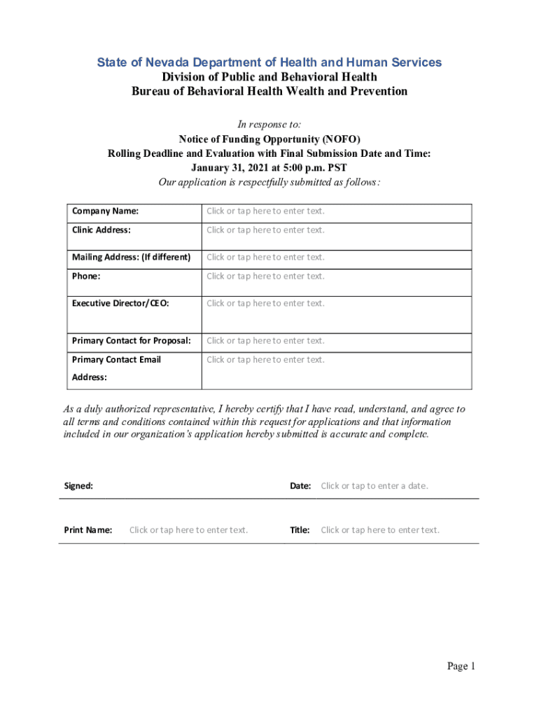 State of Nevada Department of Health and Human Services Division of Public and Behavioral Health Bureau of Behavioral Health Wealth and Prevention In response to: Notice of Funding Opportunity (NO