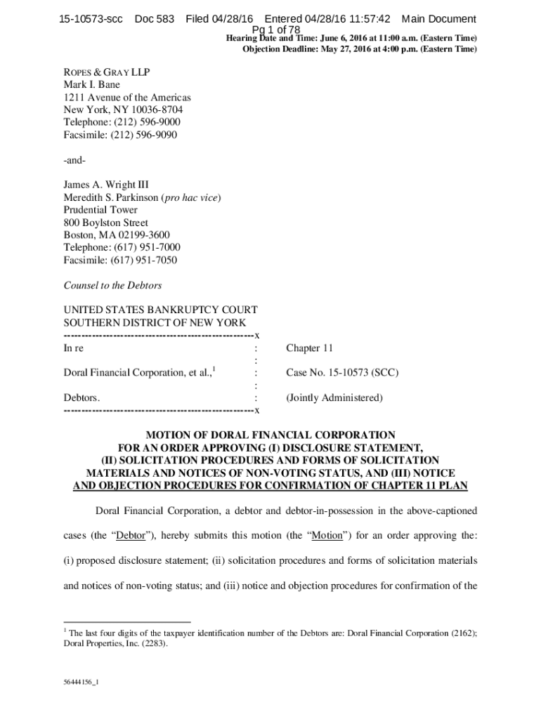 1510573sccDoc 583Filed 04/28/16 Entered 04/28/16 11:57:42 Pg 1 of 78Main Documentarian Date and Time: June 6, 2016, at 11:00 a.m. (Eastern Time) Objection Deadline: May 27, 2016, at 4:00 p.m. (Eastern