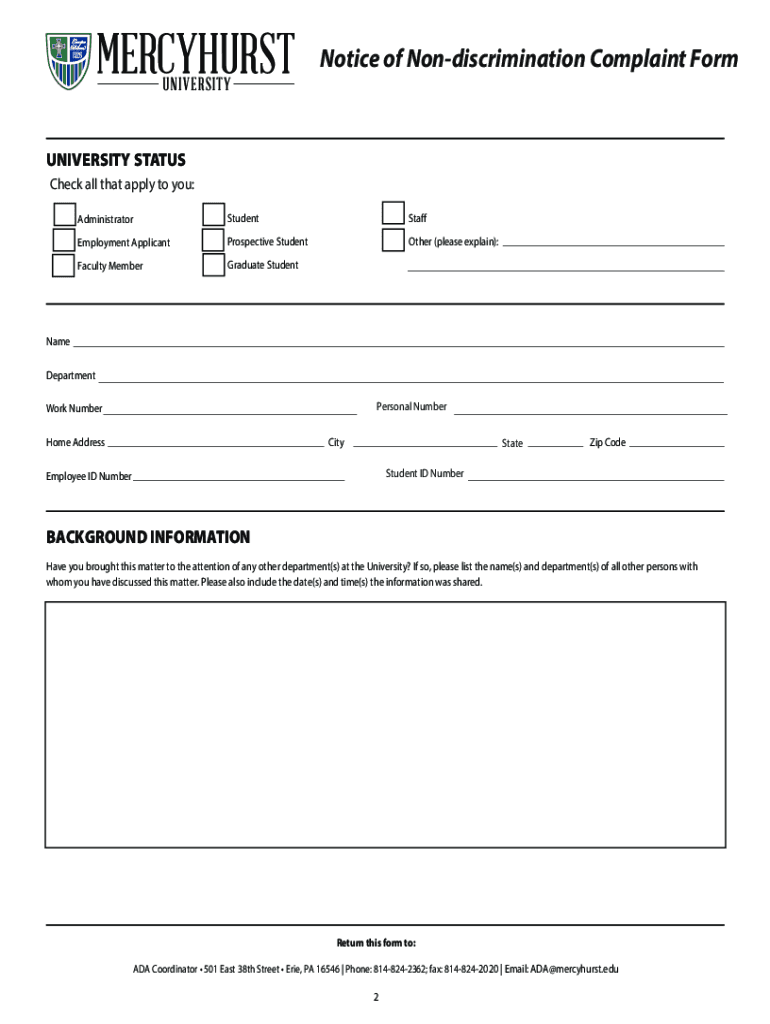 MERCYHURST UNIVERSITYEMPLOYEE AND STUDENT GRIEVANCE PROCEDURE & COMPLAINT FORM ALLEGED VIOLATIONS OF PROTECTIONS FOUND IN NOTICE OF NONDISCRIMINATION To file a complaint with the University regarding