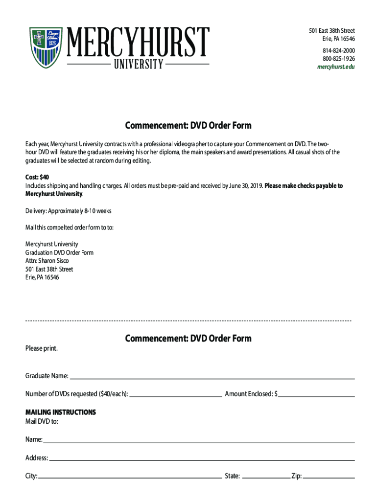 501 East 38th Street Erie, PA 16546 8148242000 8008251926 Mercyhurst.commencement: DVD Order Form Each year, Mercyhurst University contracts with a professional videographer to capture your Commencement