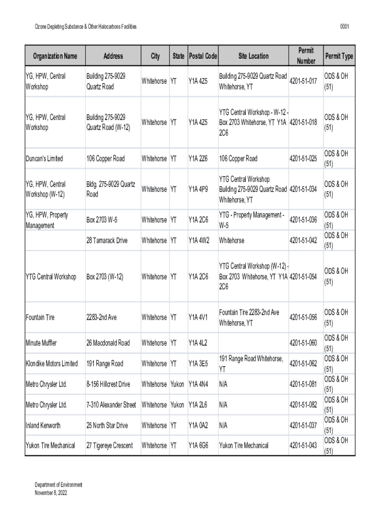 Ozone Depleting Substance & Other Halo carbons FacilitiesOrganization NameAddress0001CityState Postal Code Site LocationPermit NumberPermit Type, HOW, Central WorkshopBuilding 2759029 Quartz Road