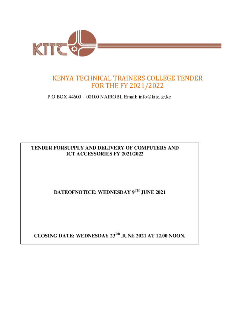 KENYA TECHNICAL TRAINERS COLLEGE TENDER FOR THE FY 2021/2022 P. O BOX 44600 00100 NAIROBI, Email: info@kttc.ac.keTENDER SUPPLY AND DELIVERY OF COMPUTERS AND ICT ACCESSORIES FY 2021/2022DATEOFNOTICE: