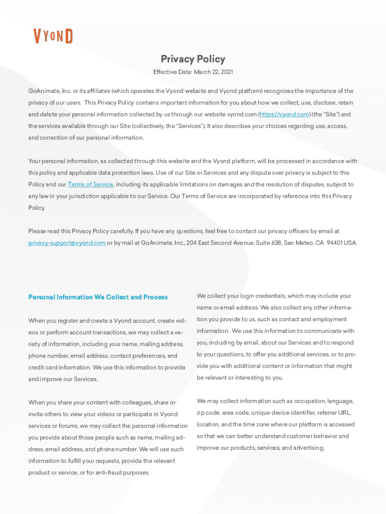 Get the free GoAnimate, Inc. Privacy Policy - Vyond