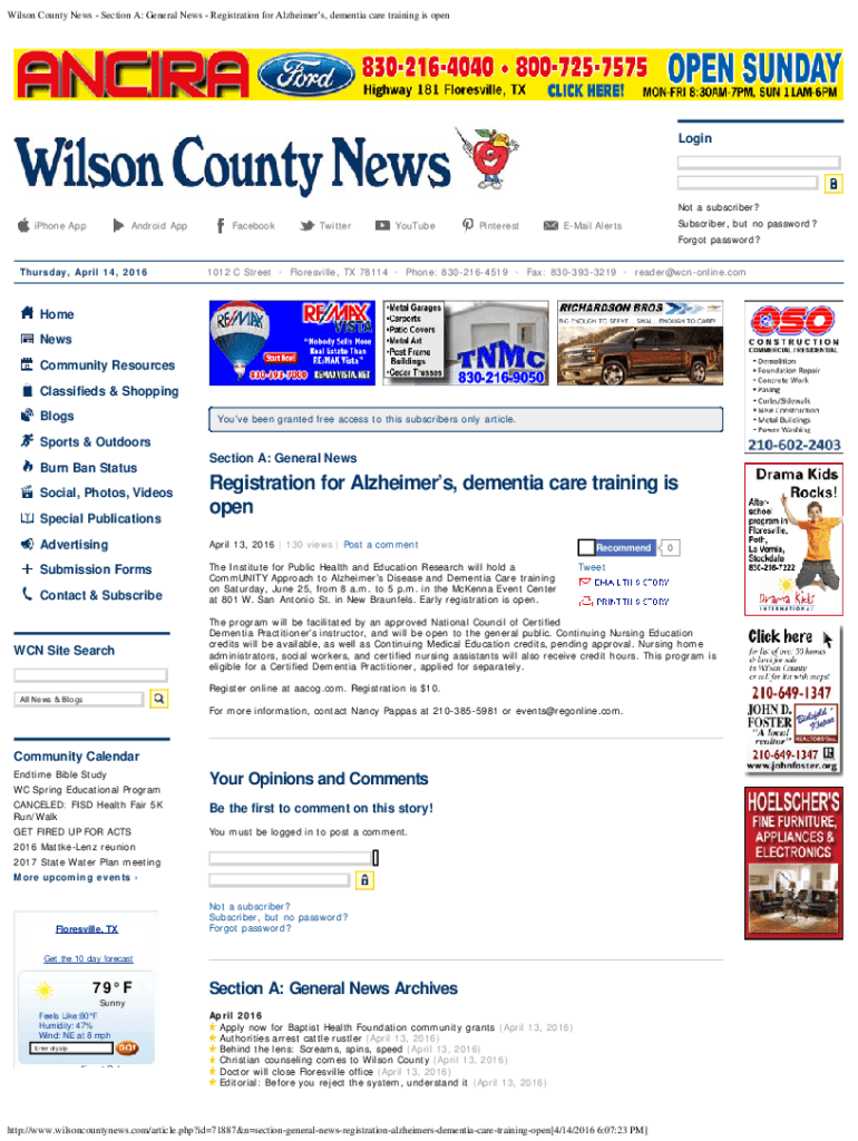 Wilson County News Section A: General News Registration for Alzheimer's, dementia care training is openLoginNot a subscriber?