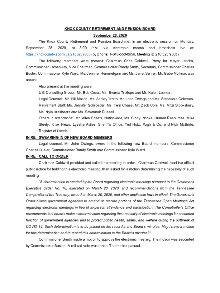 KNOX COUNTY RETIREMENT AND PENSION BOARD September 28, 2020, The Knox County Retirement and Pension Board met in an electronic session on Monday, September28,2020,at3:00P. M.viaelectronicmeansandbroadcastliveat:https://knoxcounty.zoom.us/2165259583