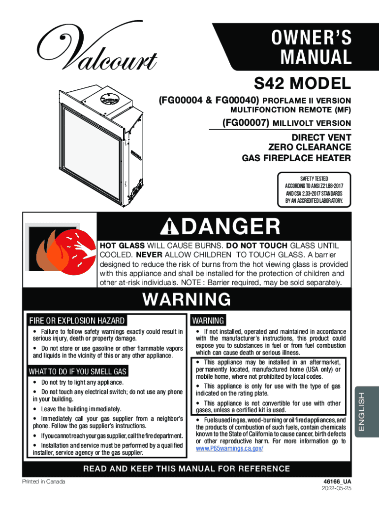 OWNERS MANUAL S42 MODEL (FG00004 & FG00040)PROFANE II VERSION MULTIFUNCTION REMOTE (MF)(FG00007)MILLIVOLT VERSIONDIRECT VENT ZERO CLEARANCE GAS FIREPLACE HEATER Safety tested according to ANSI Z21.882017