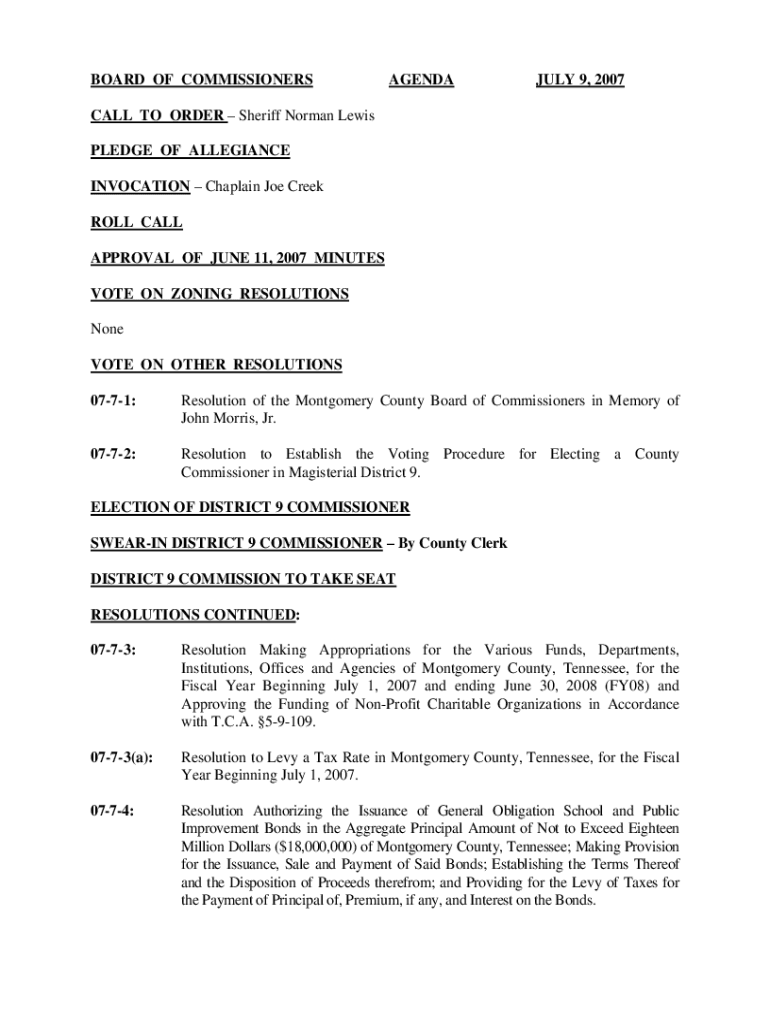 BOARD OF COMMISSIONERSAGENDAJULY 9, 2007CALL TO ORDER Sheriff Norman Lewis