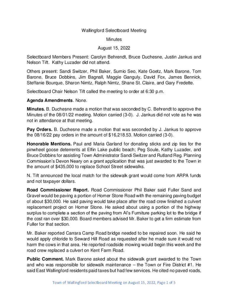 Select board Members Present: Carolyn Behind, Bruce Duchess, Justin Janus and