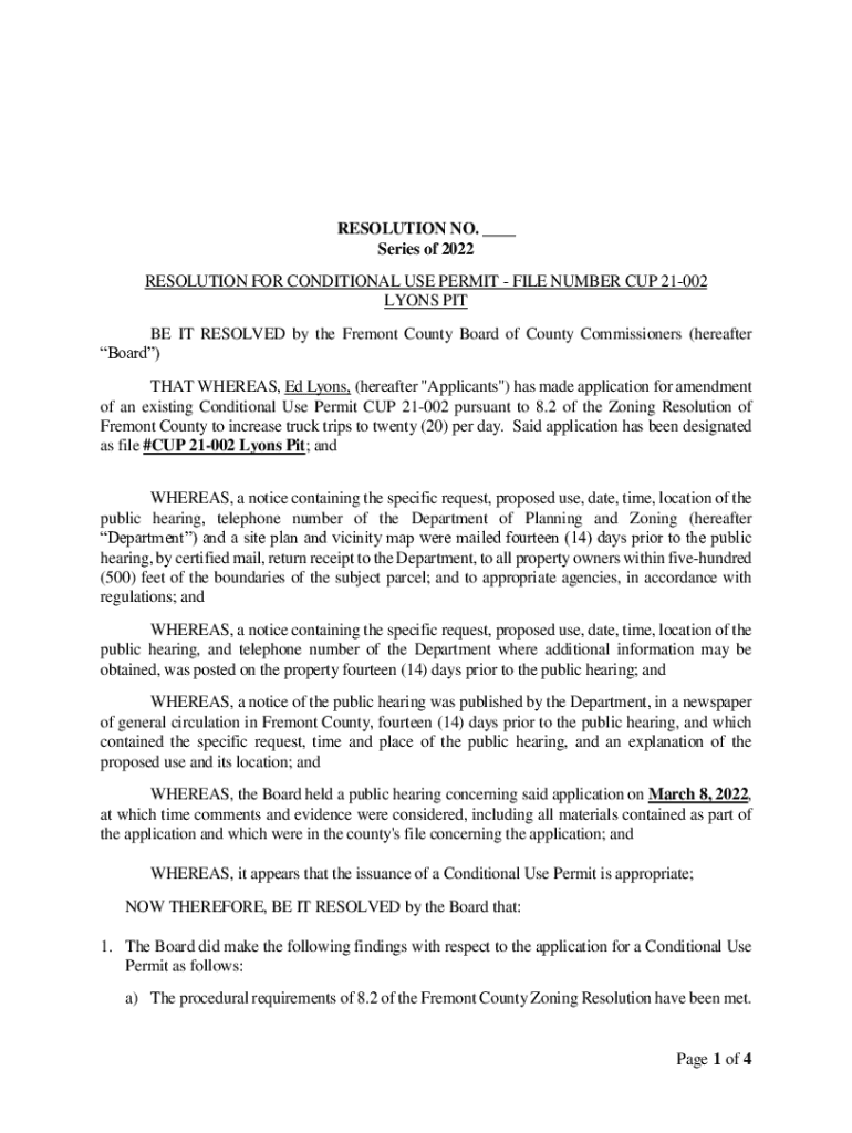 RESOLUTION NO. ___ Series of 2022 RESOLUTION FOR CONDITIONAL USE PERMIT FILE NUMBER CUP 21002 LYONS PIT BE IT RESOLVED by the Fremont County Board of County Commissioners (hereafter Board) THAT WHEREAS,