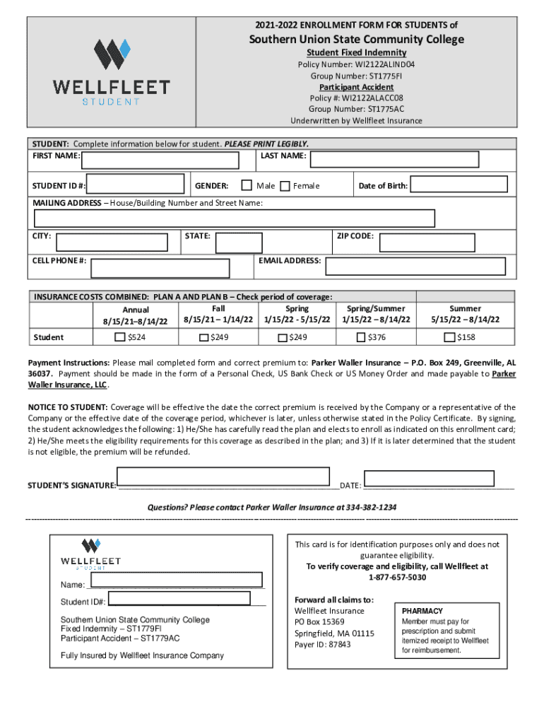 20212022 ENROLLMENT FORM FOR STUDENTS southern Union State Community College Student Fixed Indemnity Policy Number: WI2122ALIND04 Group Number: ST1775FI Participant Accident Policy #: WI2122ALACC08