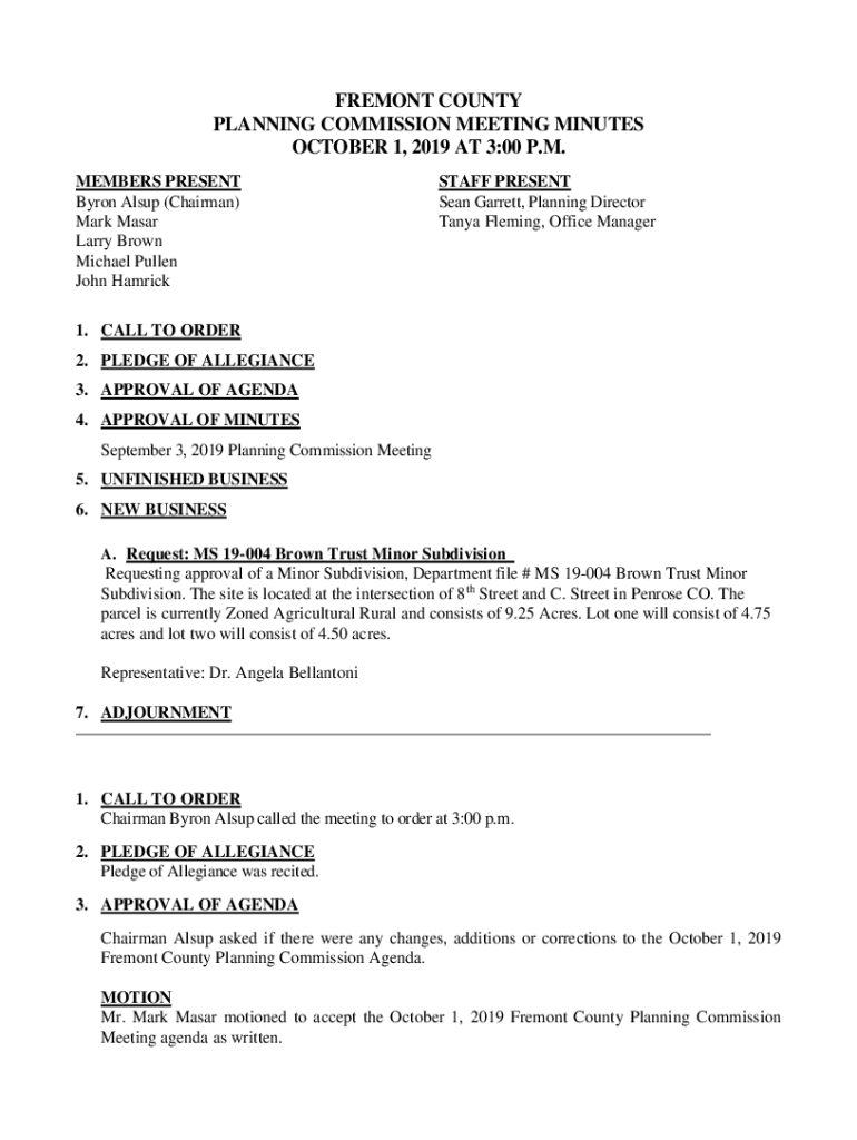 FREMONT COUNTY PLANNING COMMISSION MEETING MINUTES OCTOBER 1, 2019, AT 3:00 P.M. MEMBERS PRESENT Byron Alsop (Chairman) Mark Maser Larry Brown Michael Pulled John HamrickSTAFF PRESENT Sean Garrett,