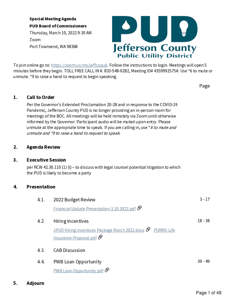 Special Meeting Agenda PUD Board of Commissioners Thursday, March 10, 2022 9:30 AM Zoom Port Townsend, WA 98368To join online go to: https://zoom.us/my/jeffcopud. Follow the instructions to login.