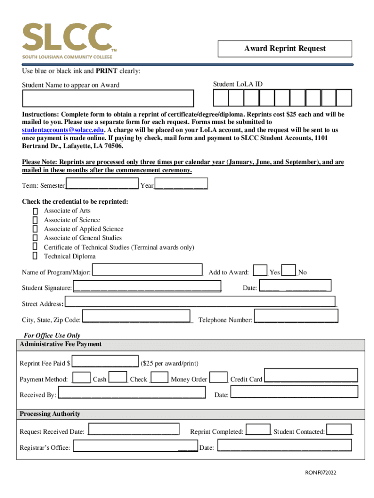 Award Reprint Request Use blue or black ink and PRINT clearly: Student Lola Student Name to appear on AwardInstructions: Complete form to obtain a reprint of certificate/degree/diploma. Reprints cost