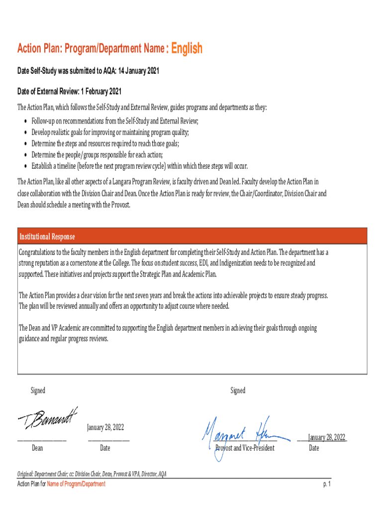 Action Plan: Program/Department Name : English Date Restudy was submitted to AQA: 14 January 2021 Date of External Review: 1 February 2021 The Action Plan, which follows the Restudy and External Review,