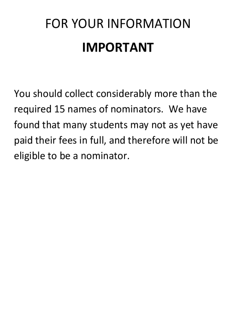 FOR YOUR INFORMATION IMPORTANT You should collect considerably more than the required 15 names of nominators. We have found that many students may not as yet have paid their fees in full, and therefore