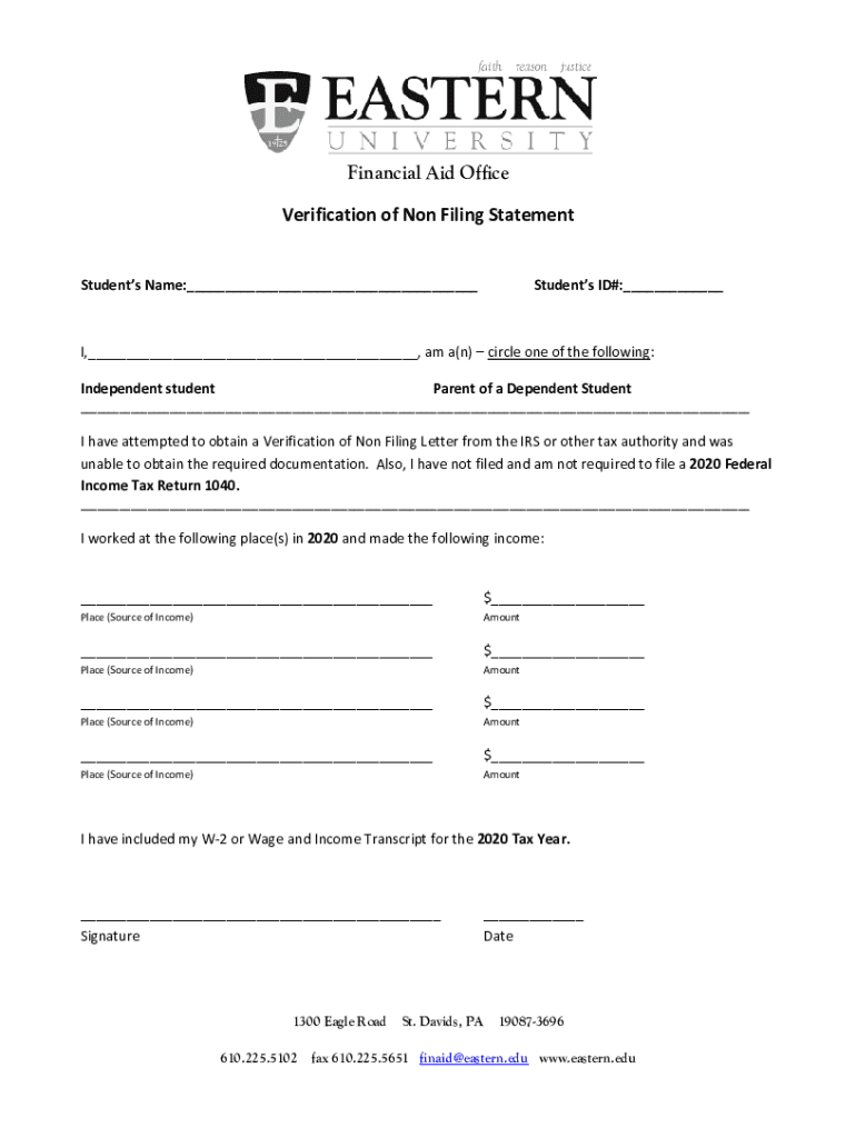 Financial Aid Office Verification of Non Filing Statement Students Name:___Students ID#:___I, ___, am a(n) circle one of the following: Independent studentParent of a Dependent Student___I have attempted