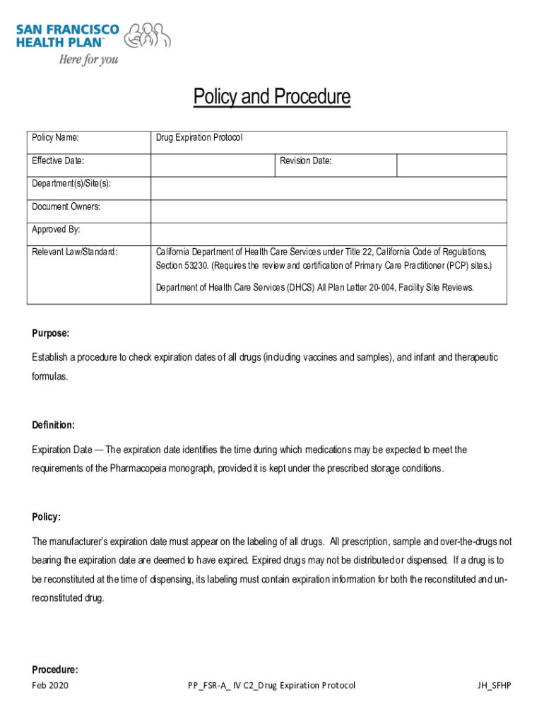 Policy and Procedure Policy Name: Effective Date:Drug Expiration Protocol Revision Date:Department(s)/Site(s): Document Owners: Approved By: Relevant Law/Standard:California Department of Health Care