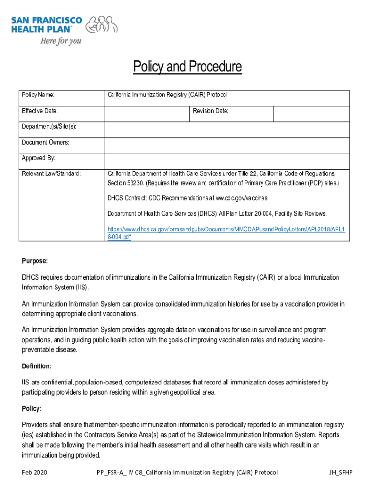 Policy and Procedure Policy Name: Effective Date:California Immunization Registry (AIR) Protocol Revision Date:Department(s)/Site(s): Document Owners: Approved By: Relevant Law/Standard:California