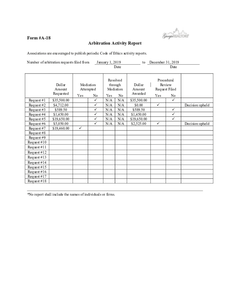 Form #A18 Arbitration Activity Report Associations are encouraged to publish periodic Code of Ethics activity reports. Number of arbitration requests filed Eurodollar Amount Requested Request #1 Request