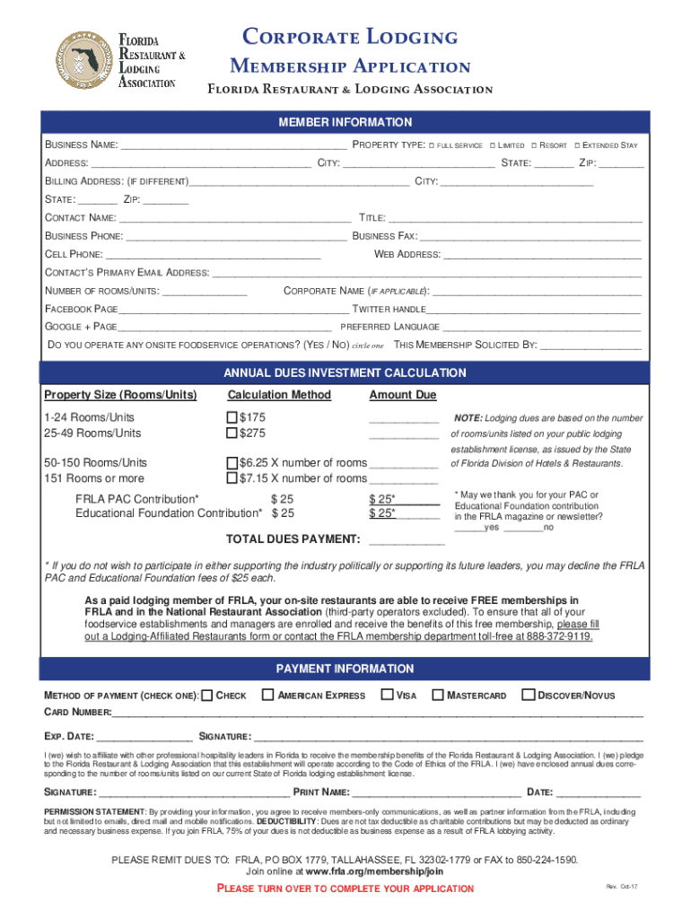 Corporate Lodging Membership Application Florida Restaurant Lodging Association MEMBER INFORMATION BUSINESS NAME: ___ PROPERTY TYPE: FULL SERVICE LIMITED RESORT EXTENDED STAY ADDRESS: ___ CITY: ___