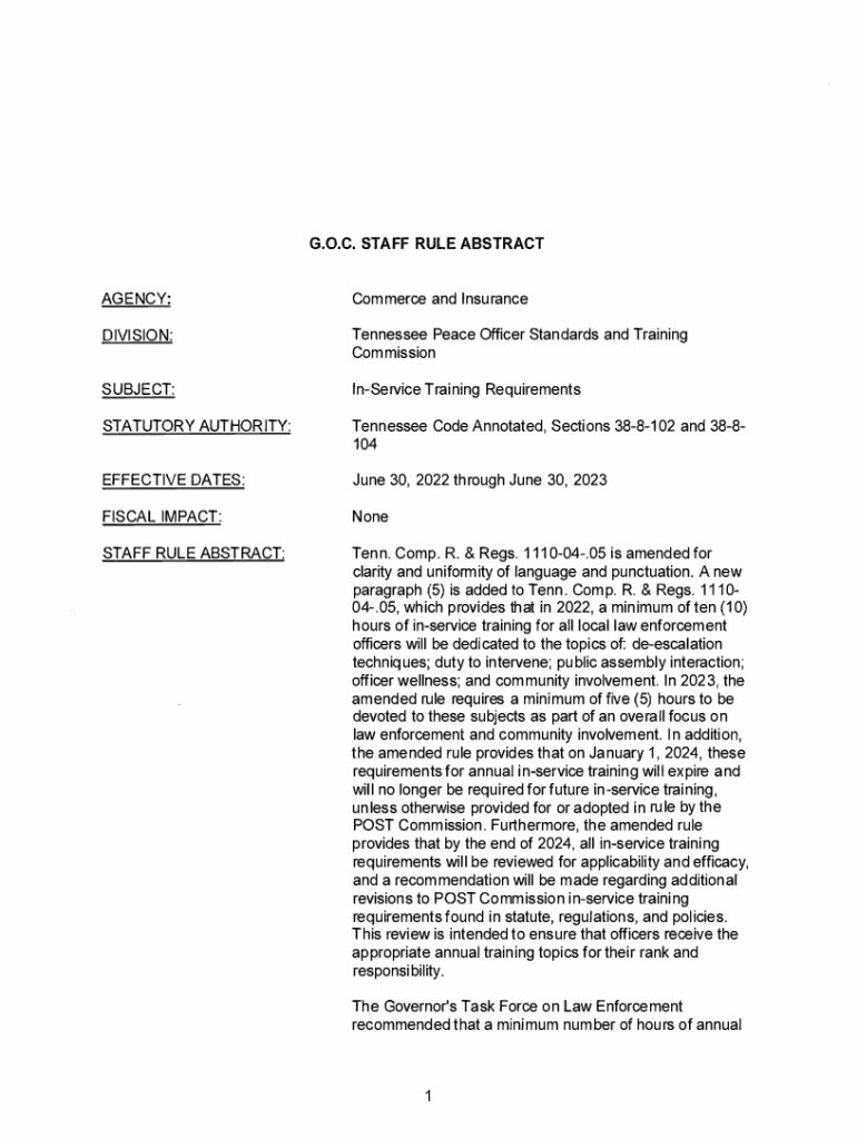 G.O.C. STAFF RULE ABSTRACT AGENCY:Commerce and InsuranceDIVISION:Tennessee Peace Officer Standards and Training CommissionSUBJECT:In-service Training RequirementsSTATUTORY AUTHORITY:Tennessee Code