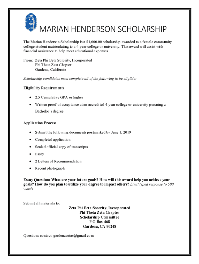 MARIAN HENDERSON SCHOLARSHIP The Marian Henderson Scholarship is a $1,000.00 scholarship awarded to a female community college student matriculating to a 4year college or university. This award will
